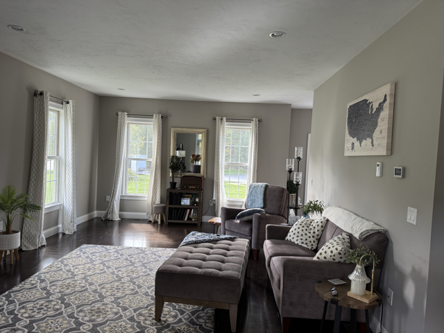 The windows in this space are everywhere and there’s a giant porch glass door that has no curtains on it, and the rest of the panes have some sheer curtains.
