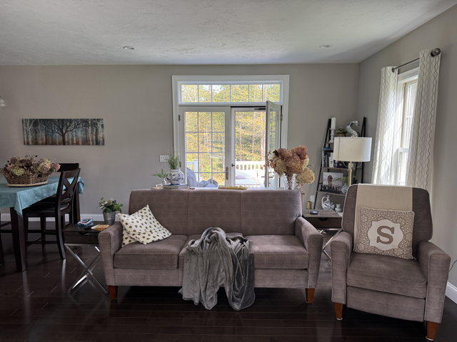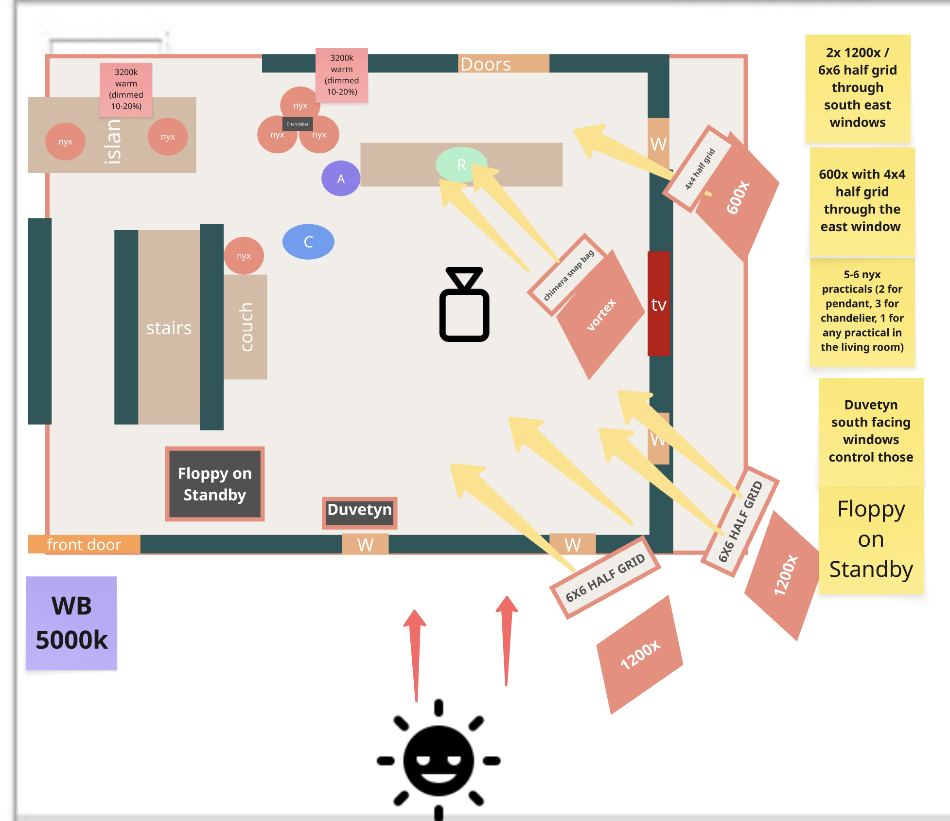 I honestly am struggling to how to light both ways because the key challenge is one couch is against a wall which isn’t ideal, one couch has the giant porch doors behind it (is north facing), which will be nuking on the trees in the background a sunny day. And initially we wouldve been lighting from the south/ east windows.. Shooting against a wall for the couch is not ideal (theres a lot of shots of main actor on a couch) shooting with the couch that has the giant doors are a nightmare for continuity especially for the final scene.