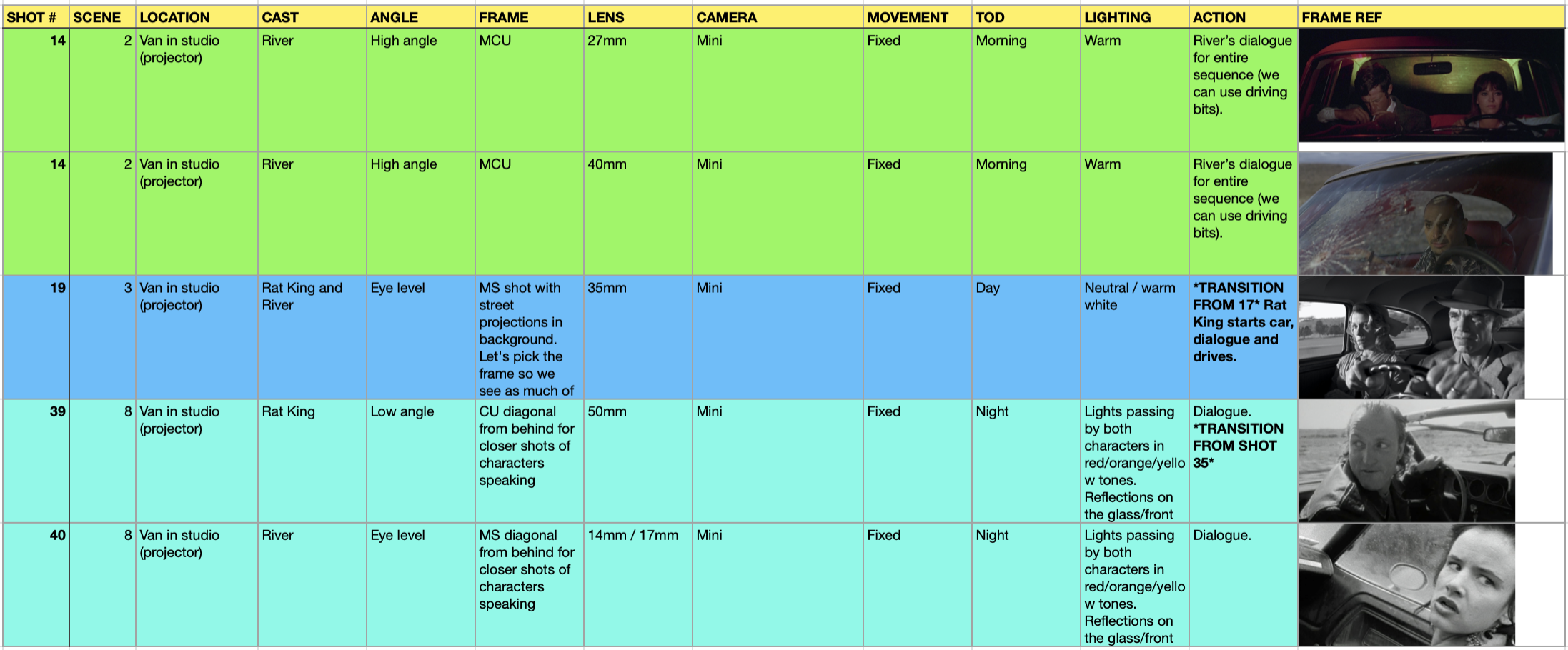 60% of the film take place in a Bedford Rascal van, some static, some in motion. The motion parts will be captured in a studio with a 20k lumen projector, displayed against a white cove cyc.