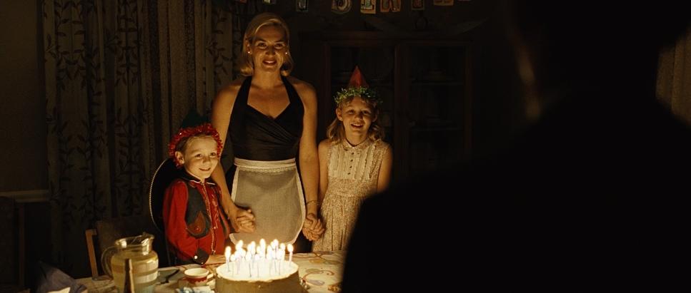 From my own analysis it looks like a large source coming from camera left to give the room some ambient levels to see into the shadows (especially since this was shot on film) and you either had enough light levels to just use the candles on the cake as the key light source or have a little tungsten source hidden behind the birthday cake?